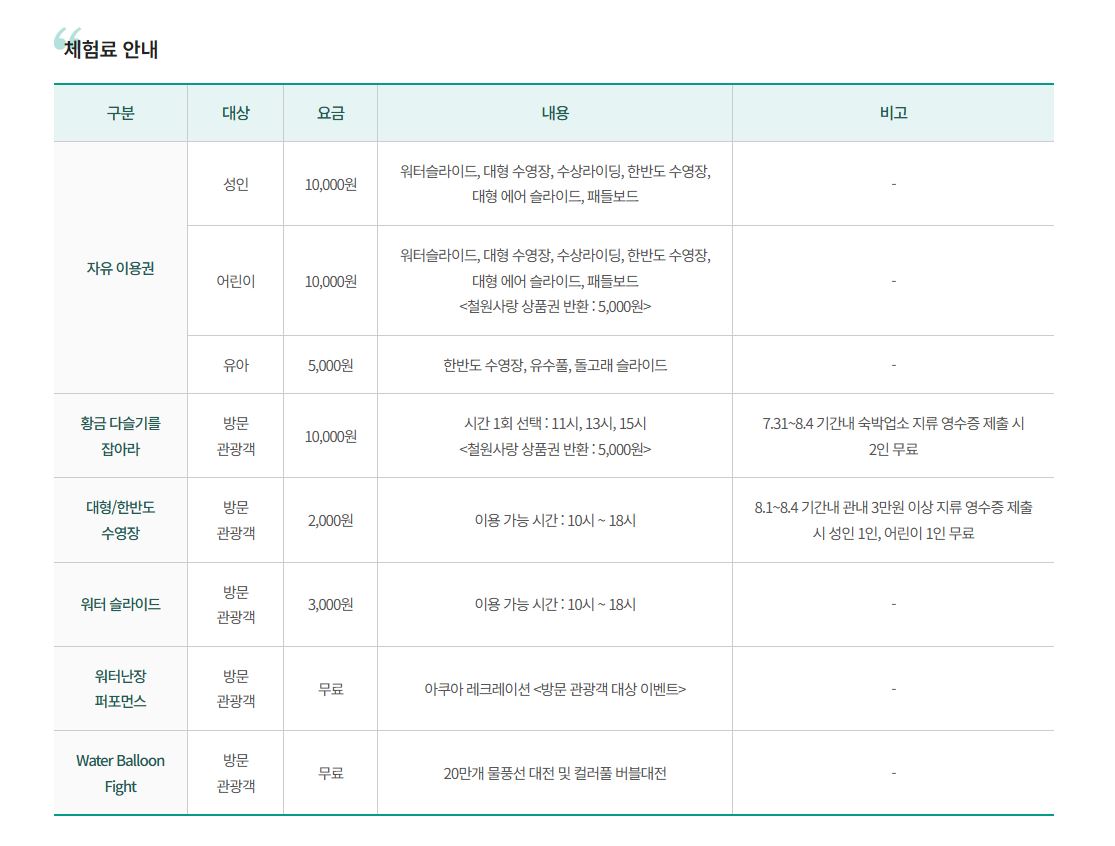 워터슬라이드, 캠핑장은 사전 예약이 필요할 수 있으니 행사 전 전화 문의를 추천드립니다.