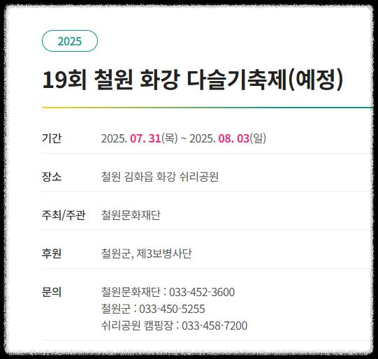 행사장을 찾기 전, 철원문화재단 홈페이지에서 최신 리플렛과 공지사항을 참고하면 더욱 알차게 즐길 수 있습니다.